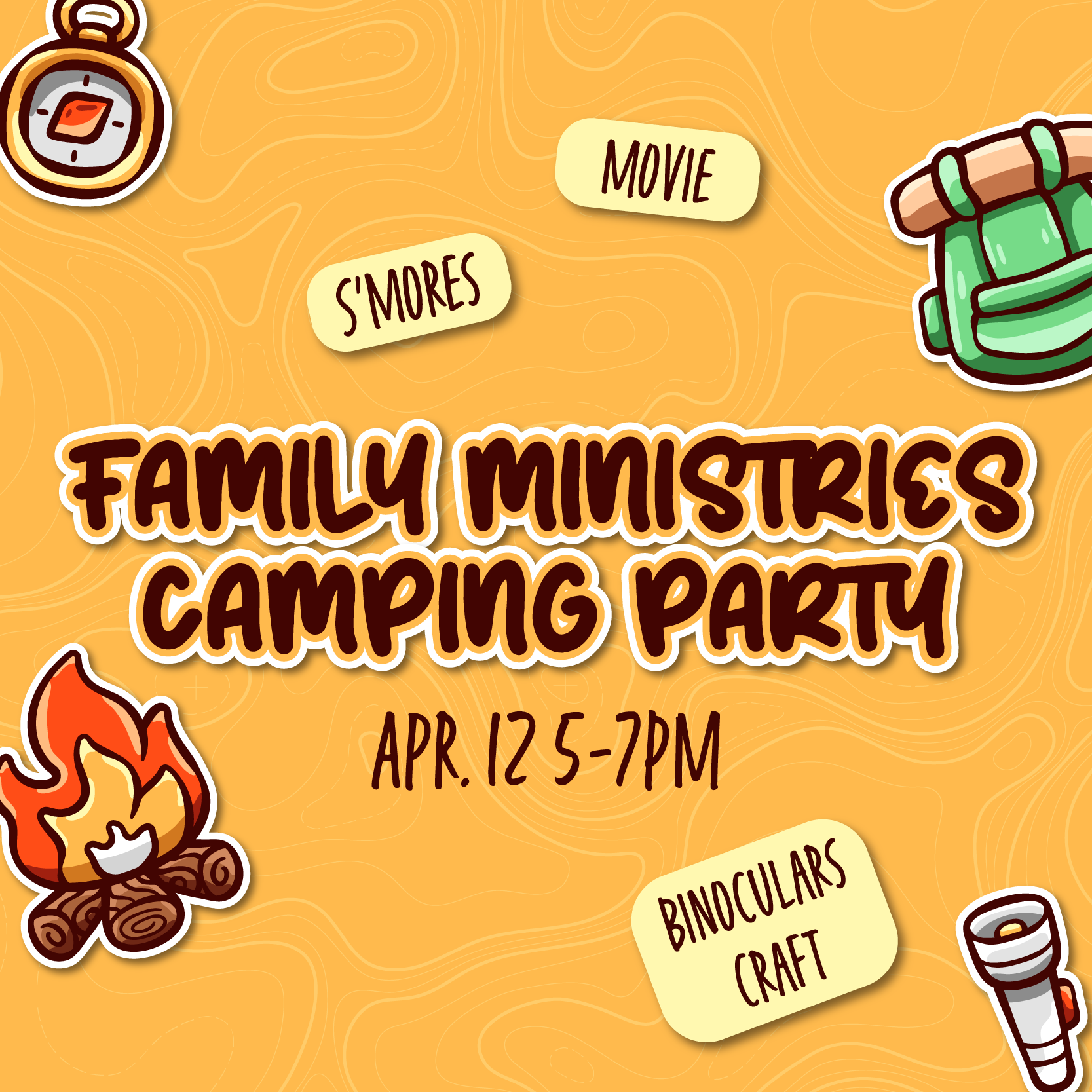 Waypoint’s Family Ministry is excited to host a family fun CAMPING PARTY on Friday, April 12, from 5-7 PM. We’ll make s’mores, do crafts, and watch a feature film! Bring lawn chairs and blankets. (The event will be moved inside if it’s raining or too cold). Contact Allie Hillman for more info.